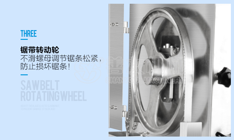 3、打开箱门,检查两刮肉片应贴紧锯带,支撑轮应托住锯带的北部。