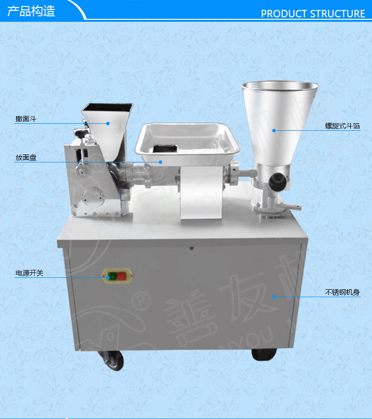 JZJ系列饺子自动成型机,本机适用于宾馆、饭店、餐厅、团体食堂加工、幼儿园、速冻饺子生产。各种肉馅、肉菜混合馅、全菜馅及其它种馅的饺子。